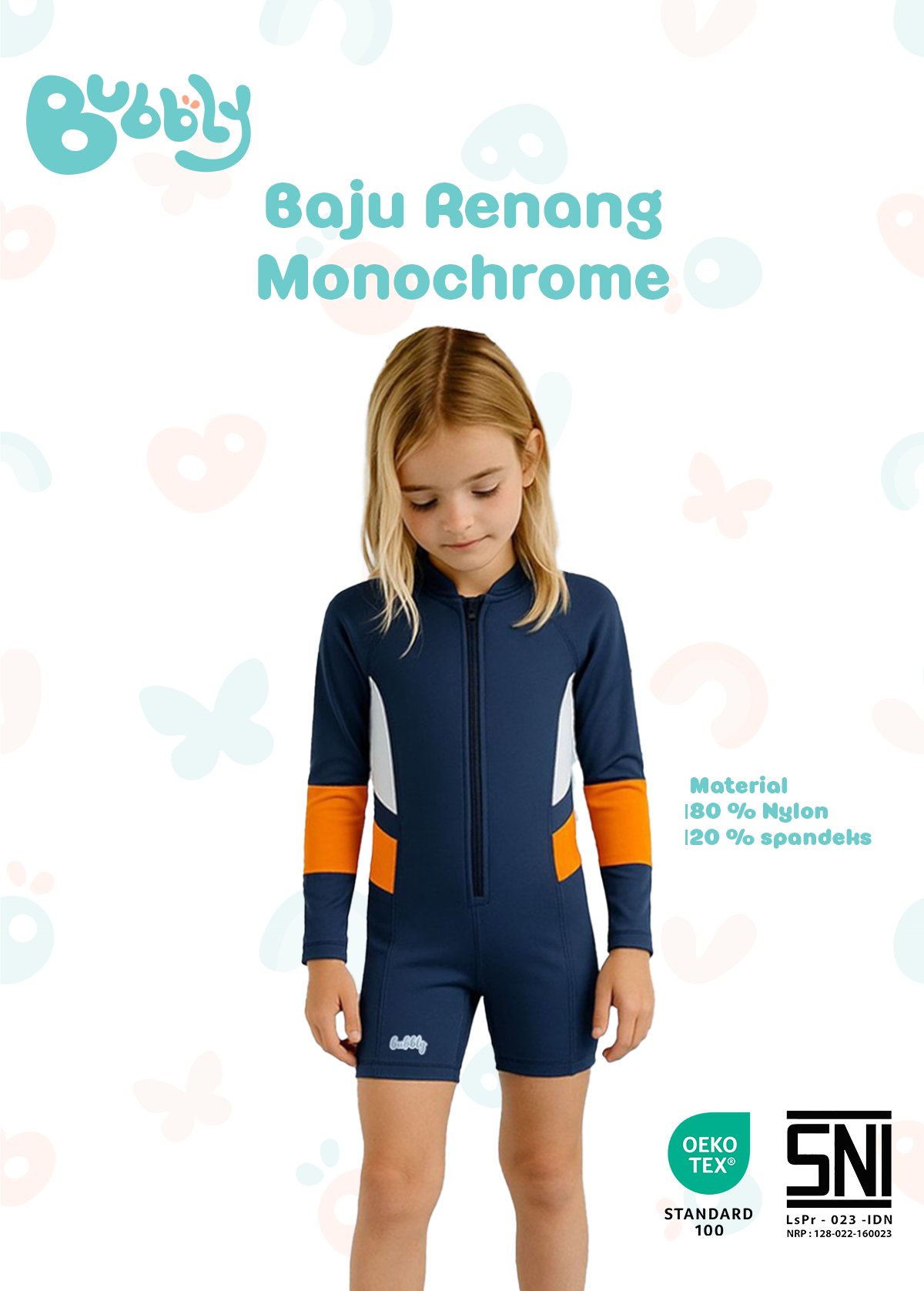 Baju renang anak model full body lengan panjang dengan desain sporty tersedia 2 warna navy kombinasi putih & orange dan hitam kombinasi merah dan putih . Dirancang khusus untuk kenyamanan dan perlindungan anak saat berenang.